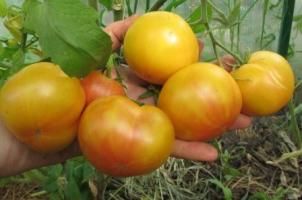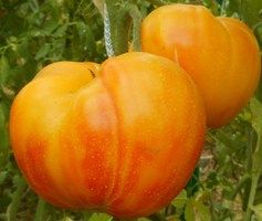Большой лимонный оксхарт (Huge Lemon Oxheart) Среднеспелый, высокорослый сорт. Плоды плоскоокруглые, крупные, 400-800 грамм, светло-желтого цвета с розовыми разводами на верхушке.