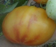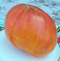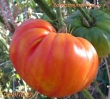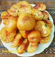 Индет, среднеспелый, крупноплодный биколор, плоско-округлые плоды, желтые с темно-розовыми полосами и разводами, слегка ребристые, массой 400-800 г Вкусный и урожайный.