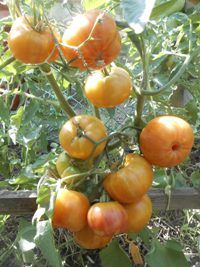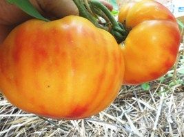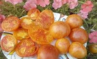 Золотой ананас (Golden Pineapple) Среднепоздний, индетерминантный, куст 1,5 метра в ОГ, в теплице высокий, биколор , оранжевые с красными разводами, плоскоокруглые, массой 250-500 грамм, мясистые, сладкие, урожайные. Очень хороший салатный сорт.