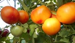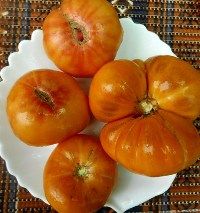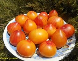 Оранжевый русский (Orange Russian) Индетерминантный, раннеспелый. Плоды двухцветные, желтые с красным, очень красивые, сердцевидные, вес от 200- 400 грамм, некоторые плоды крупнее, обычно на первой кисти. Томат замечательного вкуса, сочный, мясистый, сладкий.