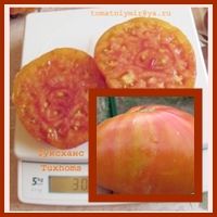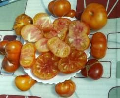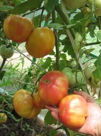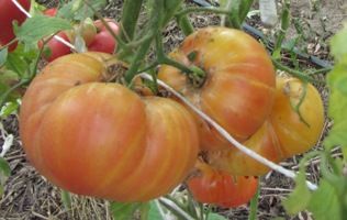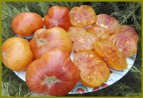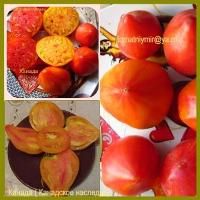 Среднеранний, высота куста в теплице около полутора метров. Плоды-биколоры, бордовые с зеленым и розовым. крупные, 250-400 грамм. На вкус сладкие.