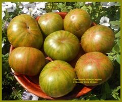 Чероки лимонные полосы (Cherokee Lime Stripes) Среднеспелый индетерминантный сорт. Плоды пллоскоокруглые, среднего размера, 150-300 грамм, красивые, с чередующимися светлыми и темными желто-зелеными и розовыми полосами, мякоть лимонно-зеленого цвета с розовой серединкой. Мясистые, сладкие с кислинкой. Очень необычный, урожайный, салатный сорт.