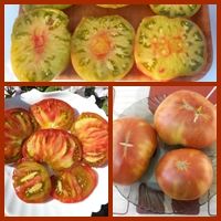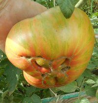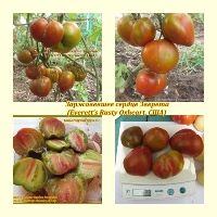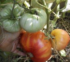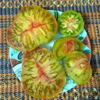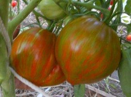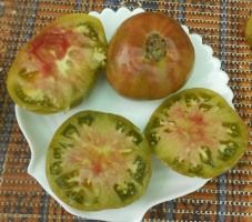 Индетерминантный, среднеспелый сорт. Плоды плоскоокруглые, весом 300-400 грамм. Цвет бордовый с зелеными полосами. Вкус со сладостью.