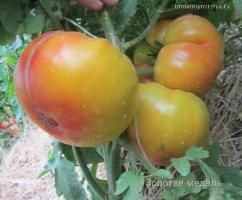 Золотая медаль (Gold medal) Индетерминантный, высота куста в ОГ около 1,8 метра, среднепоздние, вес плодов 300-600 грамм, плоскоокруглый, биколор, желтый с красными разводами, очень красивые и вкусные.