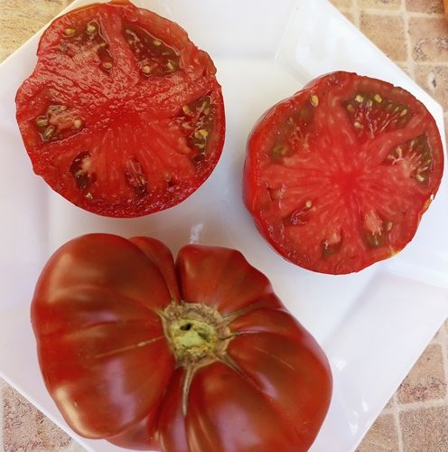 Индетерминантный, среднеспелый (ближе к среднераннему) сорт. Плоды округлые, крупные, с нкрупными ребрами у плодоножки, бордово-коричневого, на разрезе темно-бордовые. Вес- 250-400 грамм. Мякоть сочная, отличного вкуса, со сладостью. Салатный сорт. В упак. 10 шт.