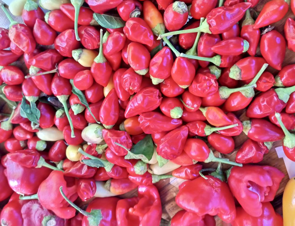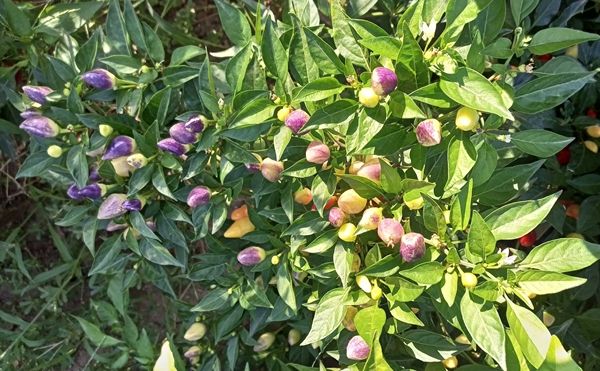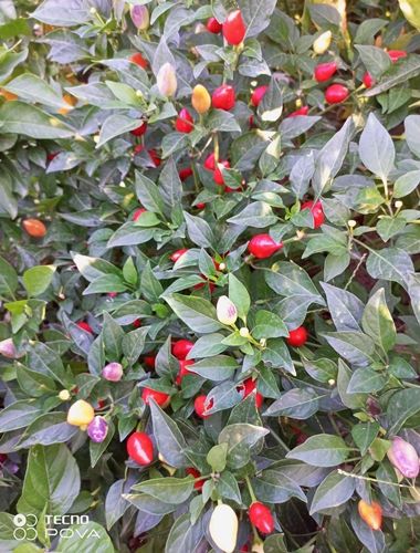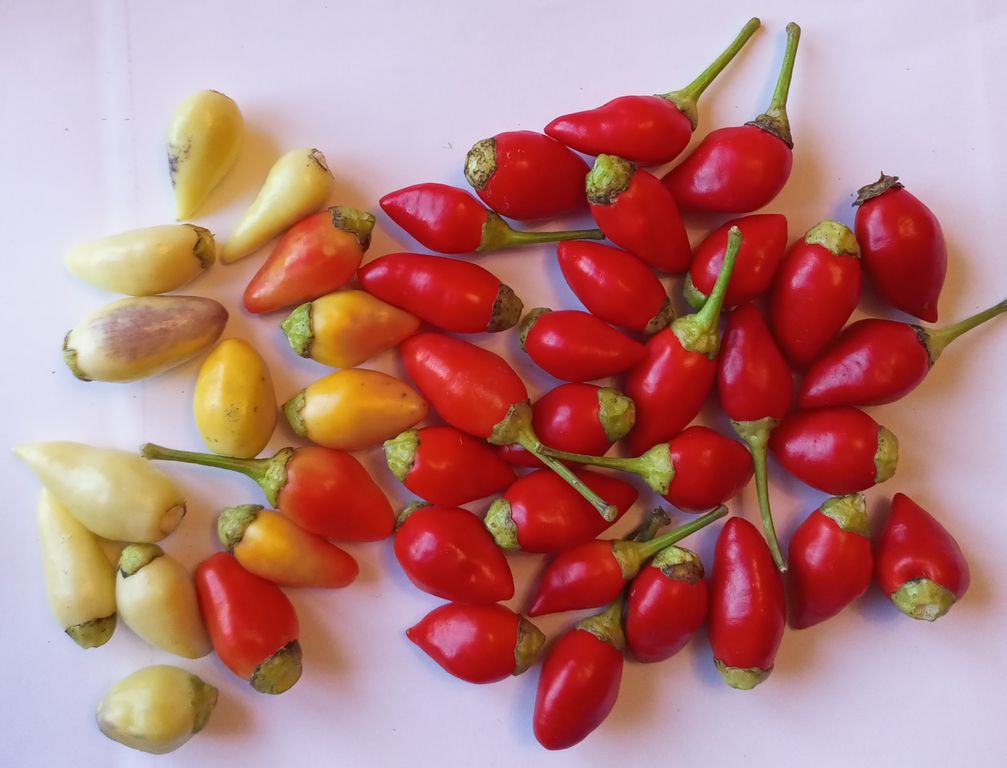 Острый перец из Бразилии, вид Capsicum baccatum. Куст невысокий, до 60 см. Плоды конусовидные, длиной около 3 см, направлены вверх, сначала кремово-белые, потом появляется небольшой фиолетовый загар, затем через оранжевый перецветают в красный цвет. Кустик смотрится очень деккоративно. Сочные, хрустящие. Отлично подходит для цельноплодного консервирования. Острота до 10000 Ск. В упак. 12 шт.