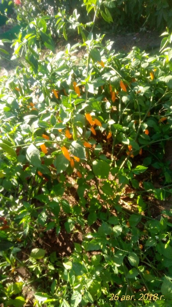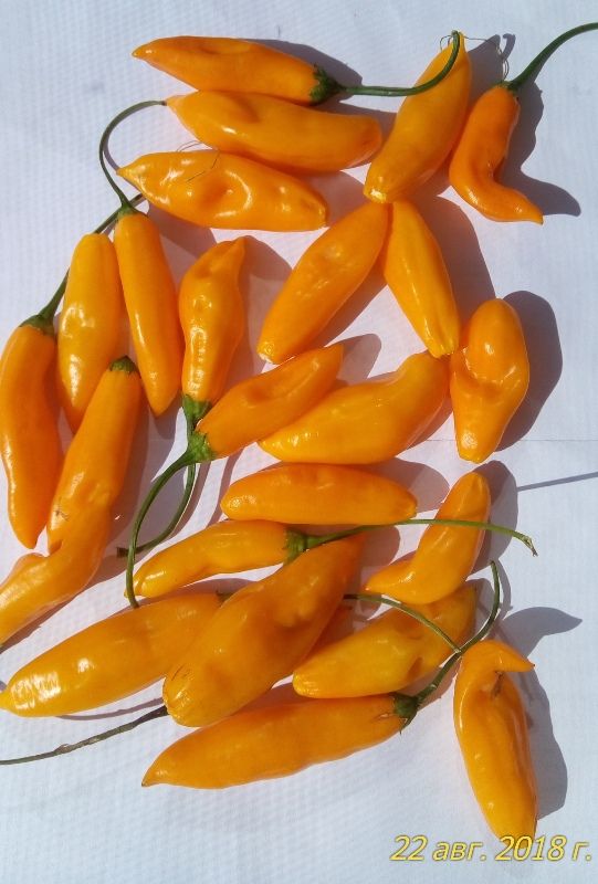 Сорт среднеспелый. Куст высотой до 1 метра, пониклый, с большим количеством тонких, слегка изогнутых перчиков, ярко-желтого цвета, длиной 5-7 см, толщиной около 2 см.