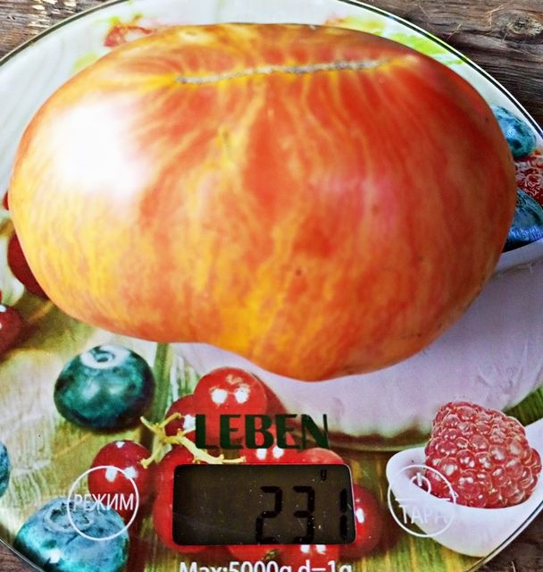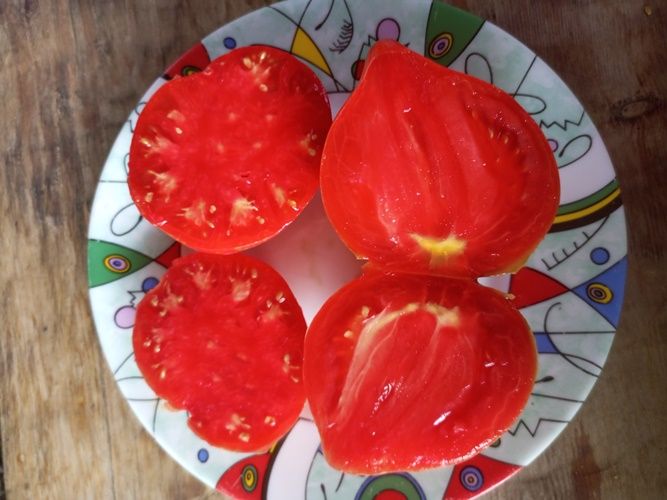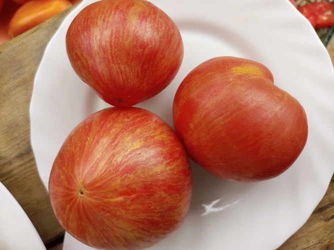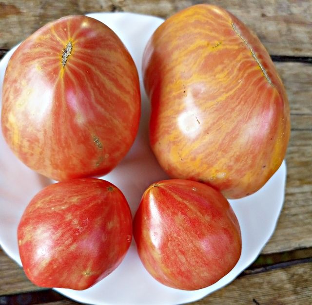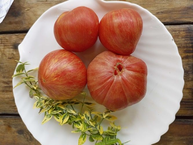 Индетерминантный сорт, куст средней силы роста, среднеспелый. Плоды розовые сердца с золотистой полоской. Вес 150-300 грамм. Мякоть сладкая. Сорт салатный. В упак. 10 шт.