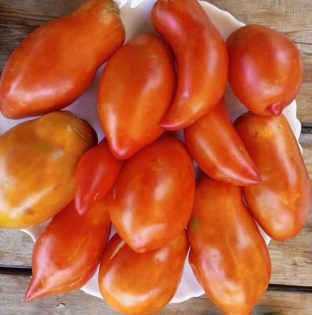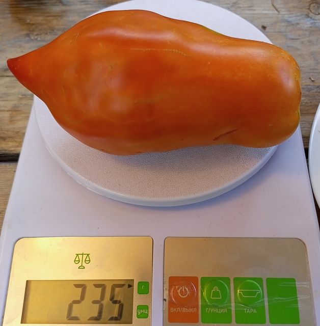 Срелнеспелый, высокорослый, индетерминантный сорт. Плоды удлиненно-перцевидные, с носиком, ярко-красного цвета, плотные, мясистые, практически без сока. Вкус сладкий, без кислоты. Массой 200-350 грамм. Назначение универсальное, прекрасно подходят для густых соусов, соков, вяления.