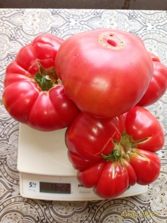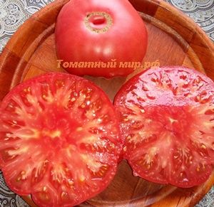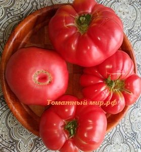 Индетерминантный, среднеспелый. Плоды плоскоокруглые, приплюснутые, слегка ребристые, крупные, 300-700 грамм, малинового-розового цвета. Настоящий помидорный вкус! Салатный и для переработки. В упак. 10 шт.