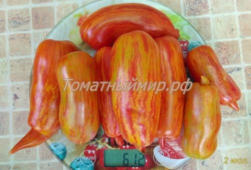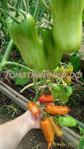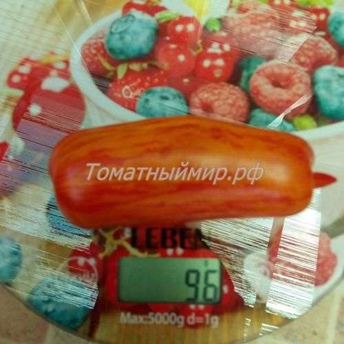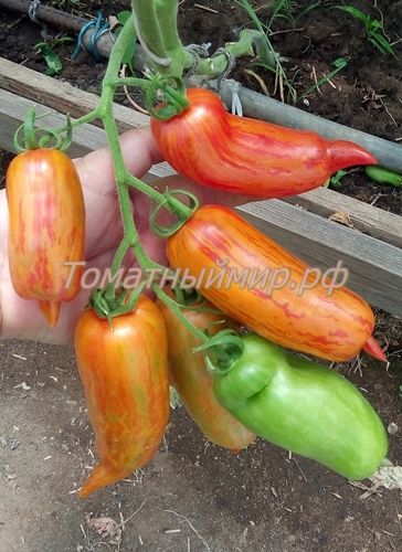 Индетерминантный, среднепоздний сорт. Плоды перцевидные, с носиком, длиной около 15 см, красные с желтыми полосками, сладкий, мясистый. Назначение универсальное. В упак. 10 шт.