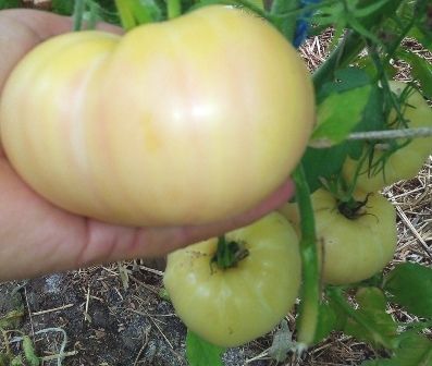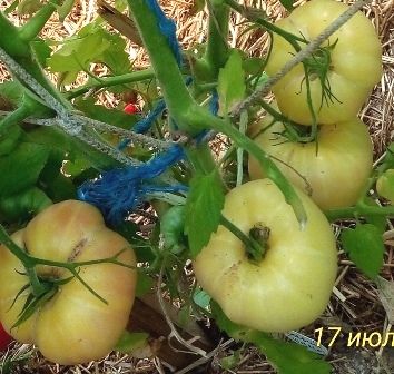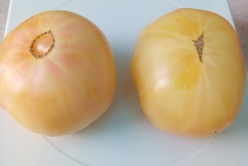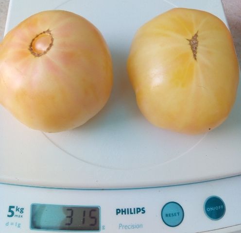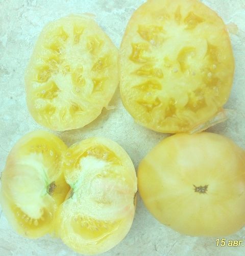 Индет, среднеспелый, плоды светло-желтые, с небольшой розовинкой в полной спелости. Вес 150-250 грамм. Сочные, вкус гармоничный. Салатный сорт, для диетпитания, переработки на соки.