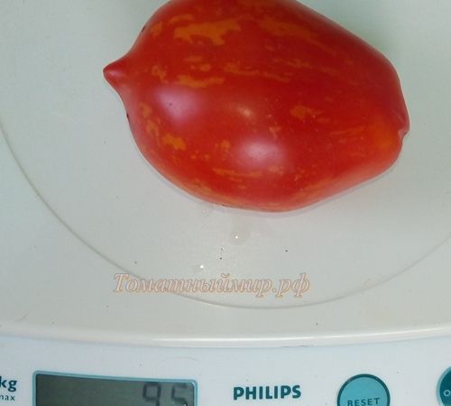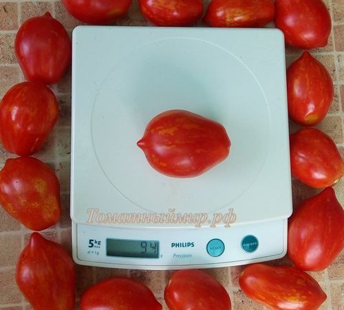 Индетерминантный, высокорослый, среднеспелый сорт, с очень большой кистью. Плоды интересной формы, грушки с носиком,красные в золотистую полоску, нарядные, яркие, плотные, весом 70-100 грамм. В упак. 10 шт.