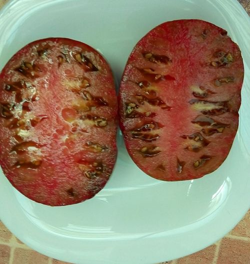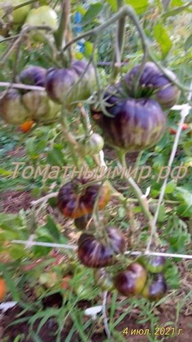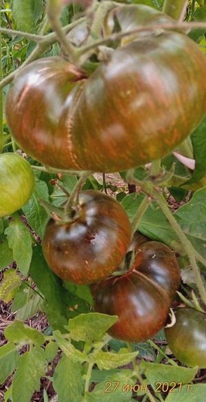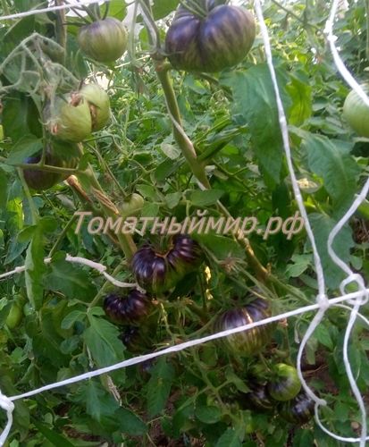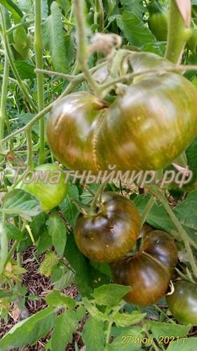 Индетерминантный, среднеспелый. Плоды плоско-округлые, массой 150-300 гр., цвет зелено-бордовый, с темными плечиками. На разрезе насыщенно темно-вишневого цвета. Вкус сбалансирован, со сладостью и кислотой, присутствуют терпкие нотки. В упак. 10 шт.
