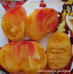 Индетерминантный, среднеспелый сорт, куст высотой 1,7-1,8 метра, с очень хорошей урожайностью в теплице и в открытом грунте. Плоды плоскоокруглые, желтые с красными пятнами, в полной спелости почти красные. Прекрасного вкуса, сладкие, без кислоты, с фруктовым привкусом. Вес 250-500 грамм. Очень вкусный салатный сорт. В упак. 10 шт.