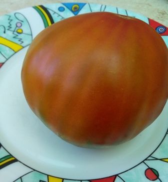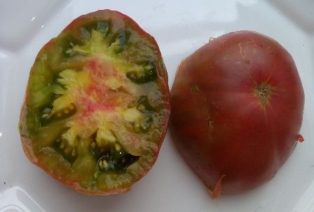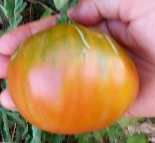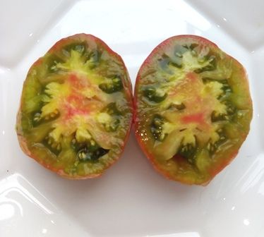 Среднеспелый, куст высотой 1,3 в ОГ. Плоды плоскоокруглые, цвет зеленовато-розовый. Мякоть на разрезе зеленая с желтым и розовым, сочная, сладкая, с небольшим фруктовым привкусом. Вес 100-200 грамм. Салатный сорт.
