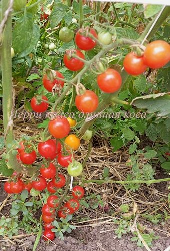 Раннеспелый, куст в ОГ был 1,2 м. Плоды округлые, красные, 10-15 грамм, сладкие. Кисть простая, длинная, с 18-20 плодами. В упак. 15 шт.