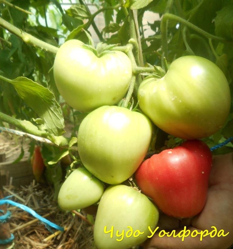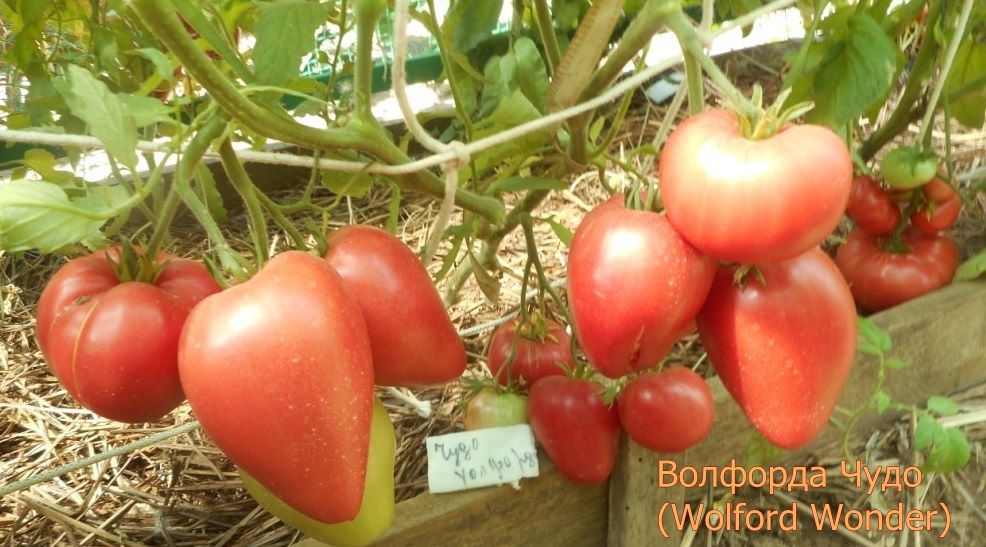Чудо Уолфорда, (Wolford Wonder) США, индет, среднеспелый. Плоды до 300 гр., розовые сердца, собраны в большие кисти (по 7-12 штук), сочные, сладкие, семян и сока практически нет. Длительное плодоношение, лучше выращивать в теплице. В упаковке 8 штук