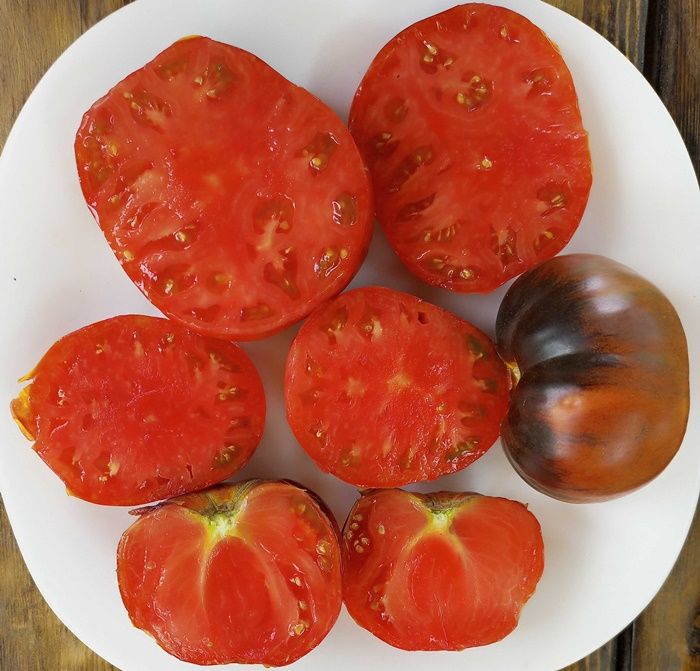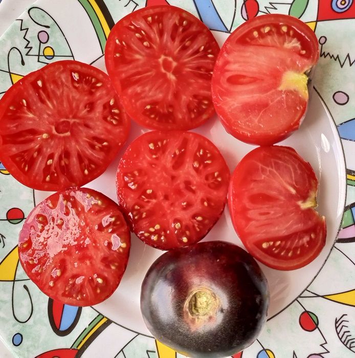 Высокорослый, среднеспелый сорт. Плоды плоскоокруглые, красные с синими плечиками, сладкие, с фруктовым ароматом, вес 100-200 грамм. Салатный сорт. В упак. 10 шт.