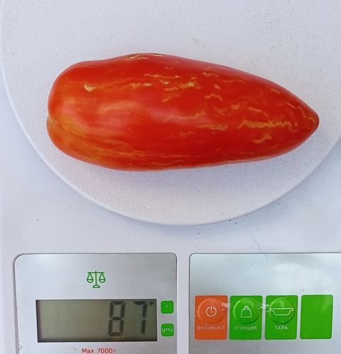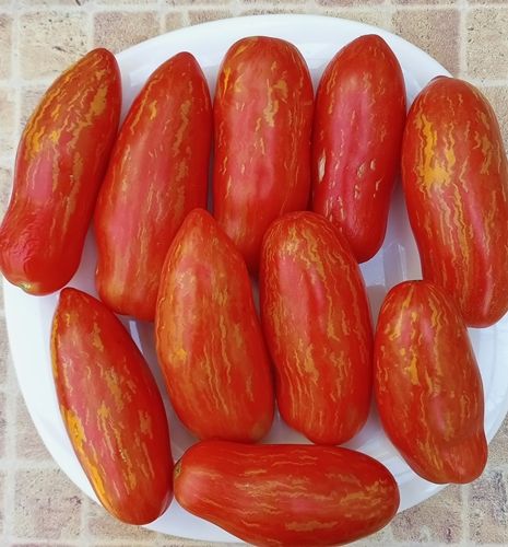 Детерминантный, среднеспелый сорт. Плоды удлиненные сливки (10-12 см), красные с желтыми полосками, вес 70-100 гр., очень плотные. Сорт для консервирования и хранения. В упак. 10 шт.