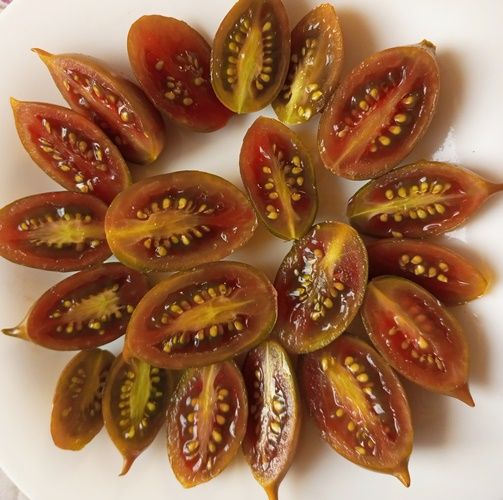 Среднеспелый сорт томата коктейльного типа. куст высотой около 1 метра в ОГ, в теплице до 1,3 метра. Плоды - удлиненные сливки с вытянутым носиком, весом 20-30 грамм. Цвет бордовый с зелеными и красными штрихами. Плоды плотные, лежкие, хорошего вкуса. Подходят для свежего употреблелия и консервирования. В упак. 10 шт.
