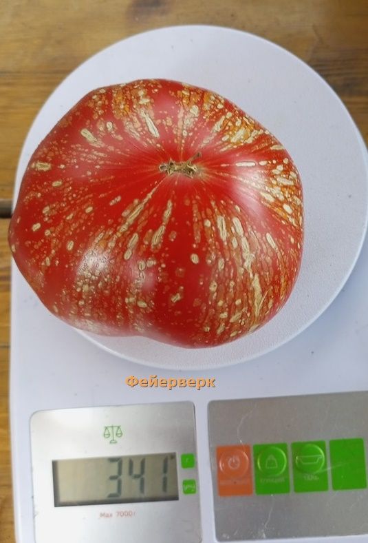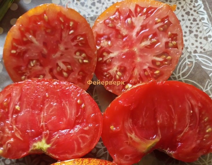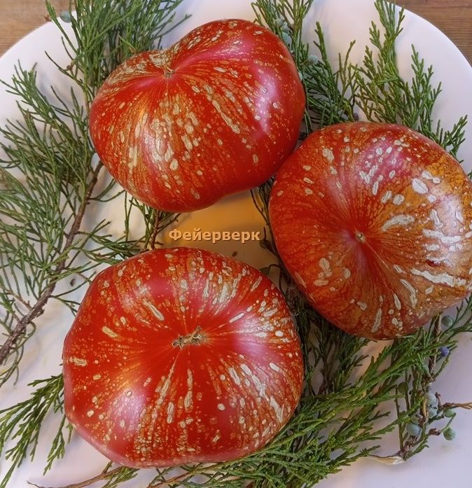 Индетерминантный, в теплице 1,8 метра, среднеранний сорт. Плоды плоскоокруглые, ярко-красные, с золотыми штрихами и полосками, на разрезе красный. Мякоть сочная, вкус со сладостью. Вес 200-300 грамм. Салатный сорт. В упак. 10 шт.