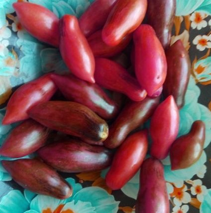 Среднеспелый сорт, куст высотой до метра. Плоды сосульки, бутылочной формы, розовые с антоциановыми полосками, при ярком освещении становятся сплошь синими. Вес 30- 50 гр. В упак. 8 шт.