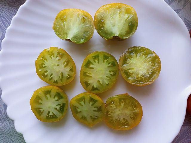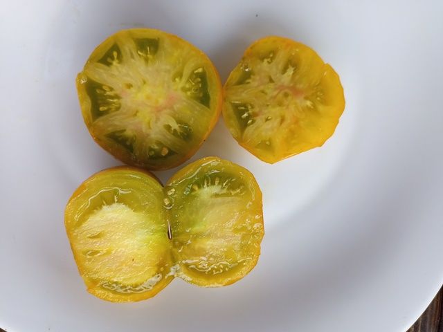 Сорт урожайный, среднеранний, куст в ОГ 70 см. Плоды округлые, желто-зеленые в полной спелости, на разрезе светло-зеленые. Вес около 100 грамм. Мякоть сочная, с пряными нотками.