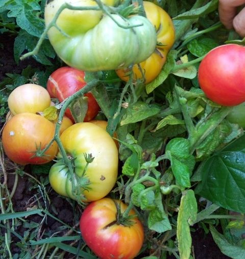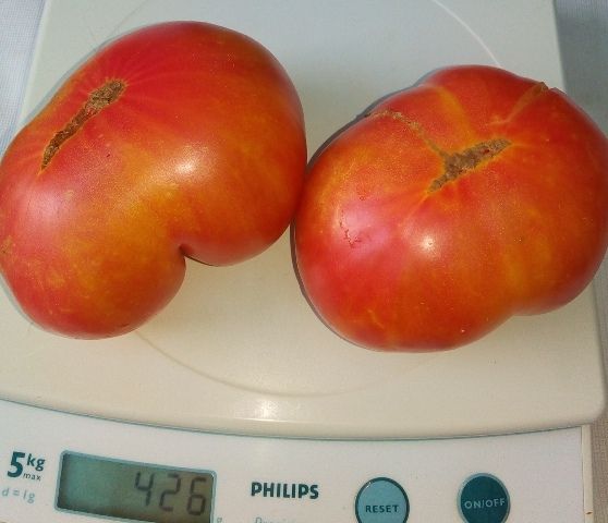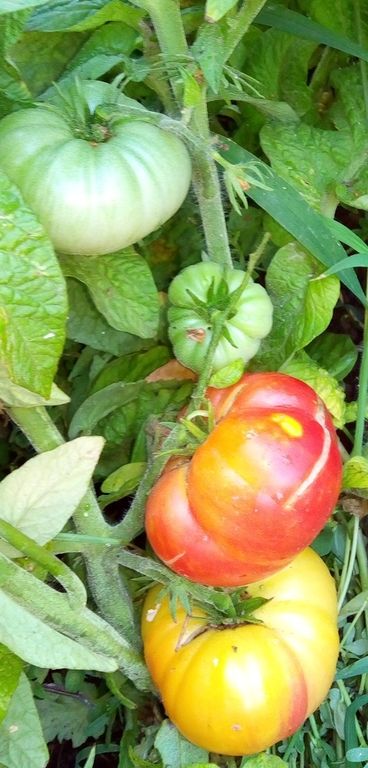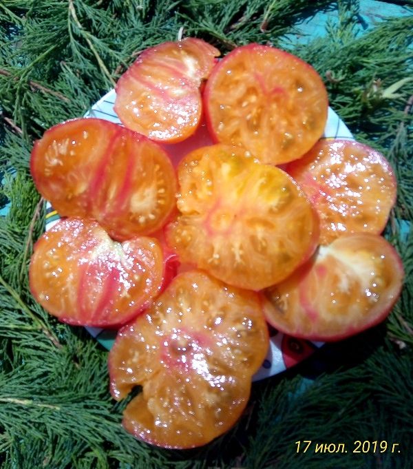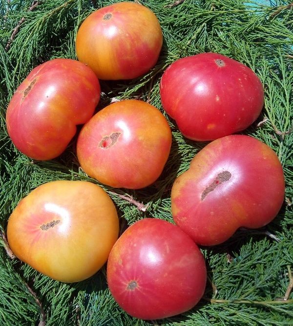 Среднеспелый, детерминантный сорт. В ОГ высота куста была около 1 метра. Плоды плоскоокруглые, некоторые слегка вытянуты лодочкой, биколоры, желто-оранжевые с розовыми разводами. Вес 150- 250 грамм. Урожайный. Лист морщинистый. В рассаде очень компактный и растет медленно. Можно сеять пораньше. В упаковке 10 шт. семян