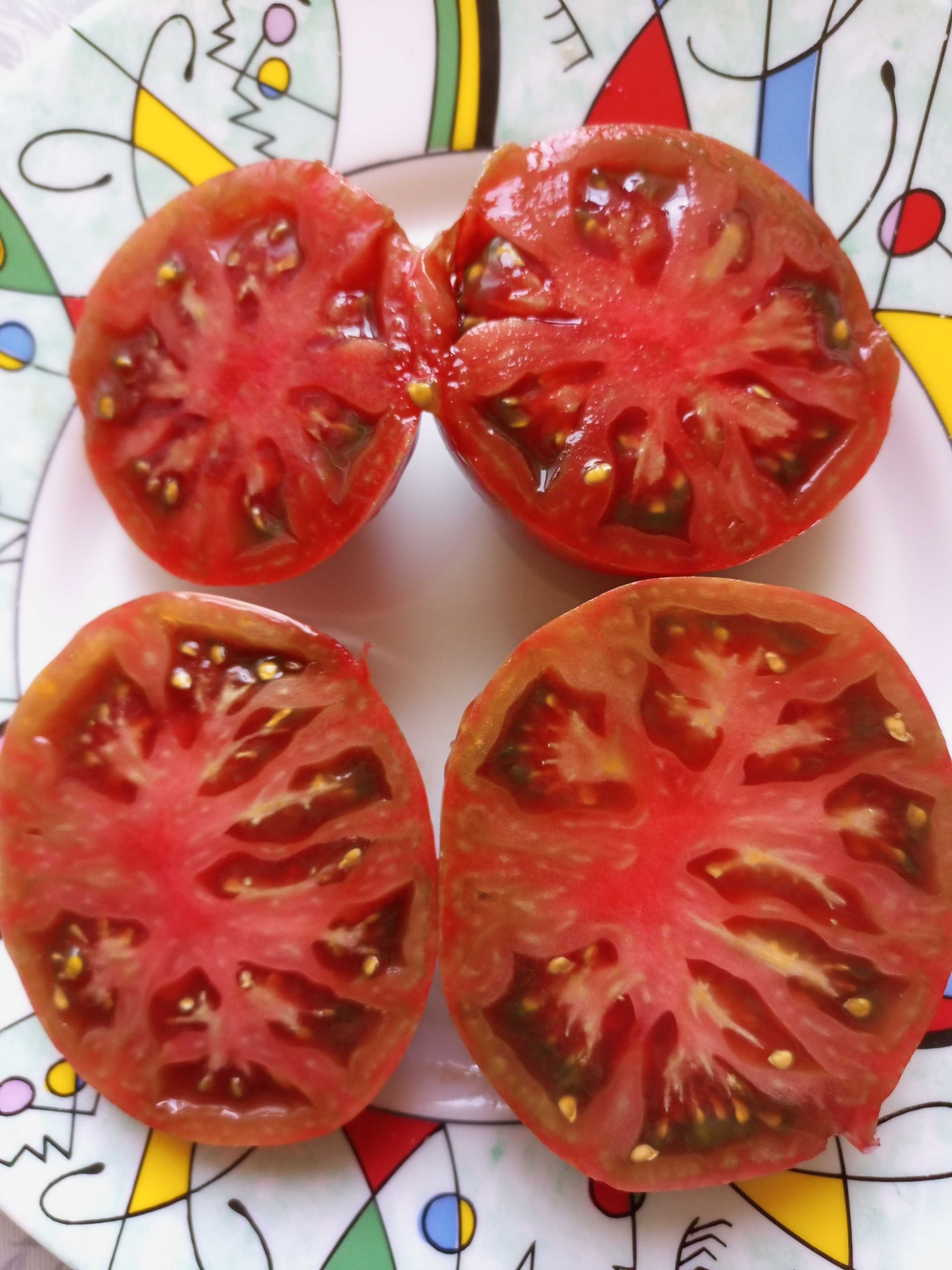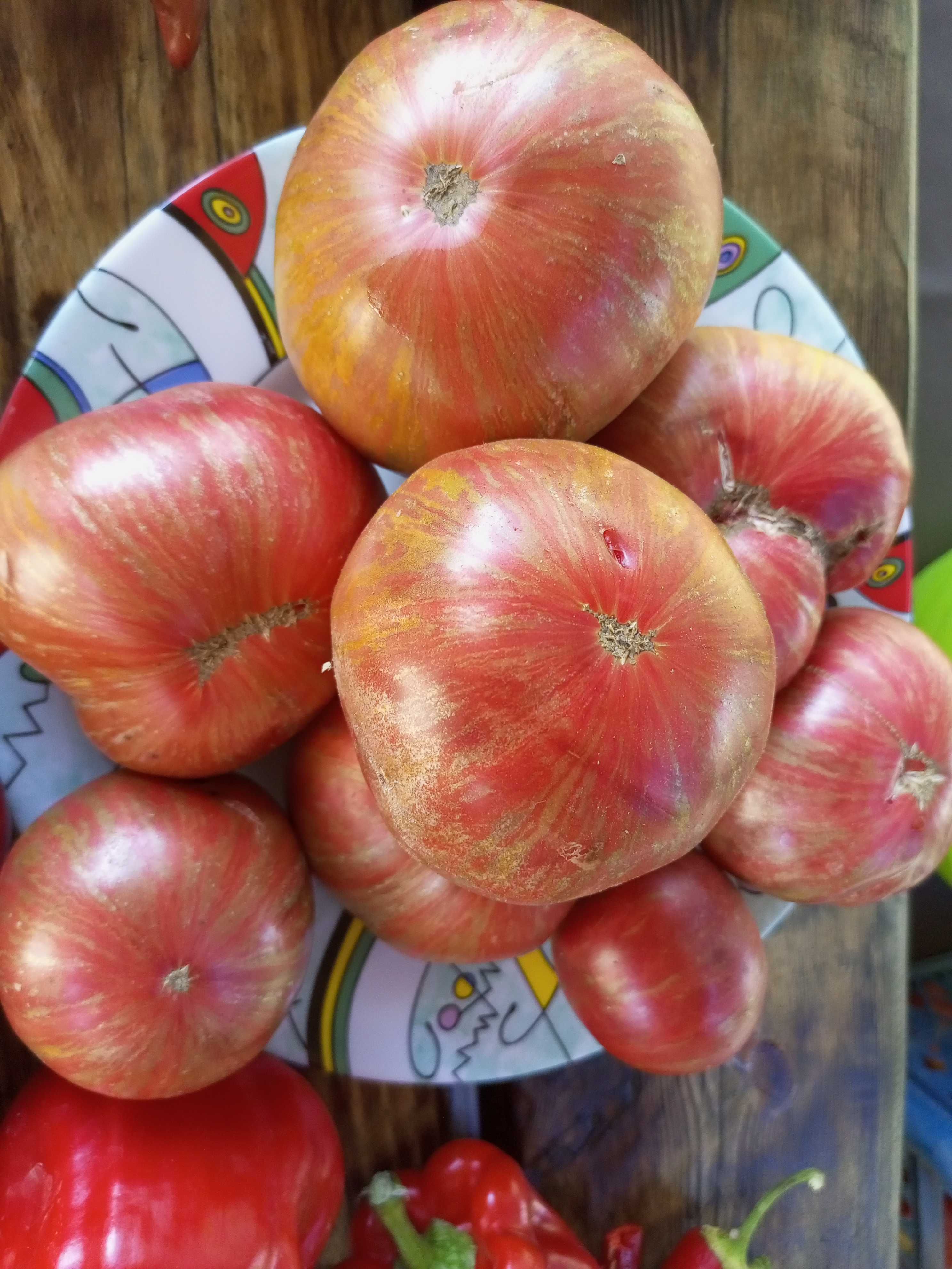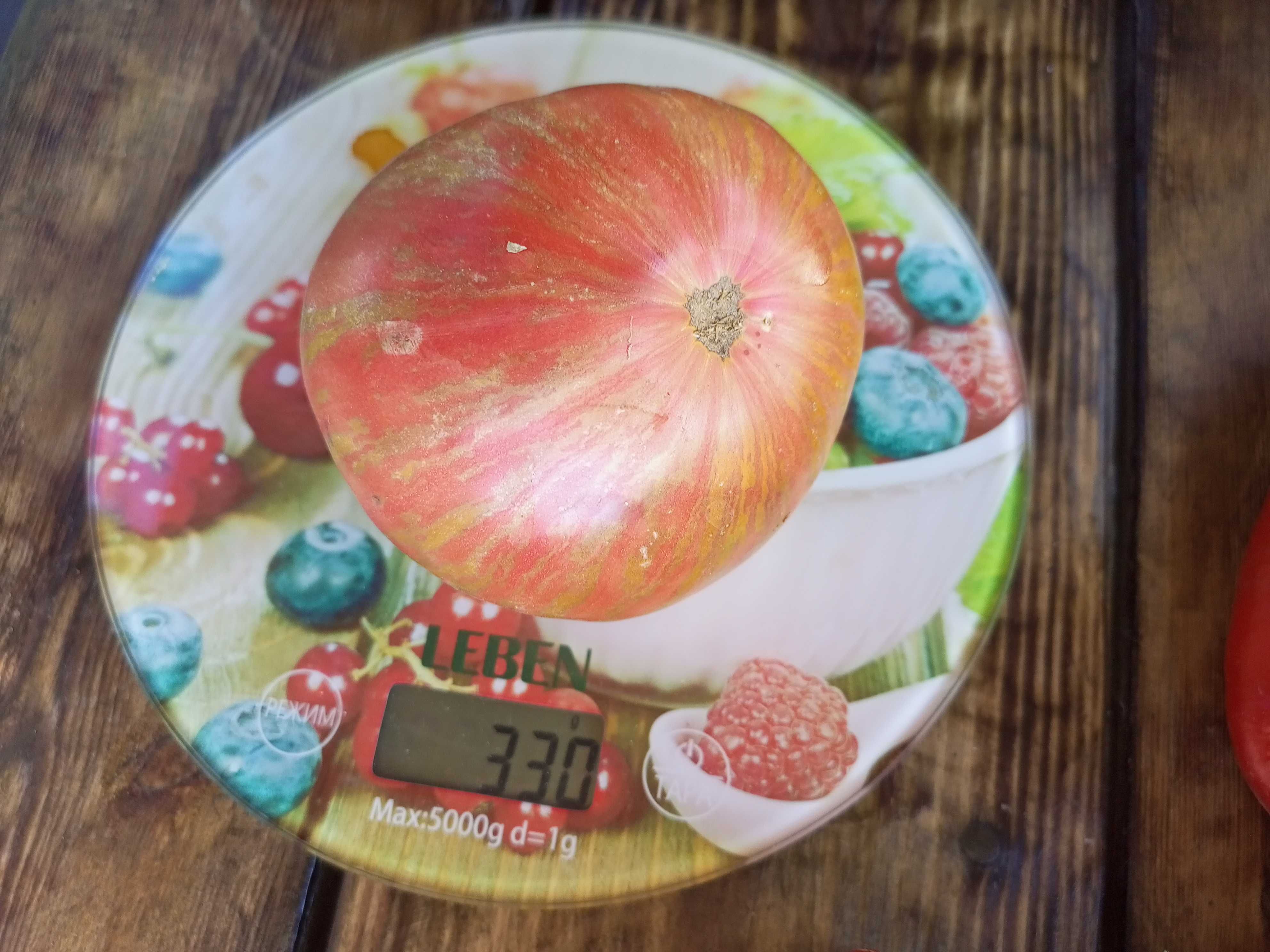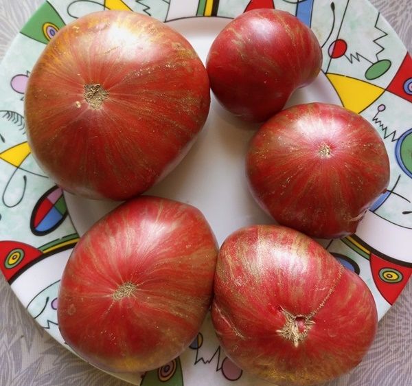 Сорт очень урожайный, с длительным периодом плодоношения, среднеспелый, высота куста в ОГ была 70-80 см. Плоды плоскоокруглые, бордовые с зеленоватыми полосками, в полной спелости становятся золотистыми. Вкус пряный, со сладостью и небольшой кислинкой. Вес 250-400 грамм. Салатный сорт. В упак. 10 шт.