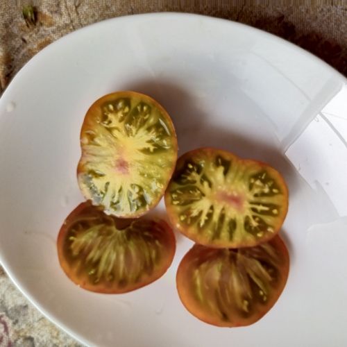 Среднеспелый детерминантный, высота куста около 1 метра. ,Плоды округлые бордово-коричневые с зелеными штрихами, мякоть бордово-зеленая желтая, сладкая, с фруктовым вкусом. Вес 80-150 грамм. Универсальный сорт. В упак. 10 шт.