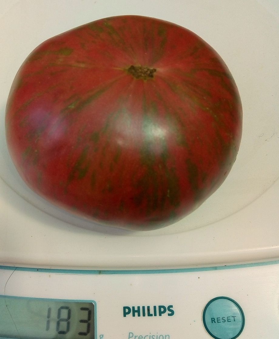 Сорт среднеспелый, в ОГ был 60-80 см. Плоды плоскоокруглые, бордово-розовые, в зеленую полоску, мякоть темно-бордовая. В упаковке 8 штук семян