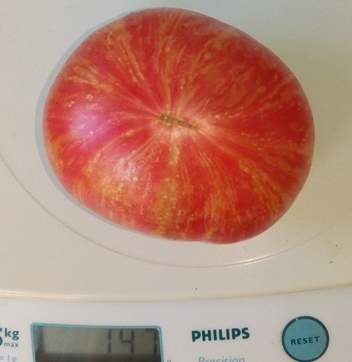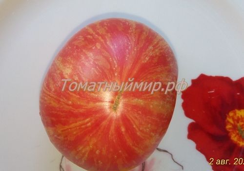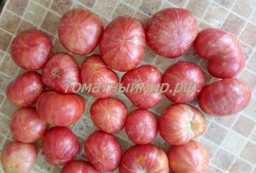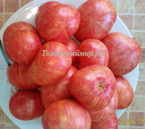 Среднеспелый, урожайный сорт. Высота куста в ОГ 60-80 см. Плоды плоскоокруглые, розового цвета с золотыми полосками, вкус со сладостью, вес 100- 180 грамм. Салатный сорт. В упак.10 шт.