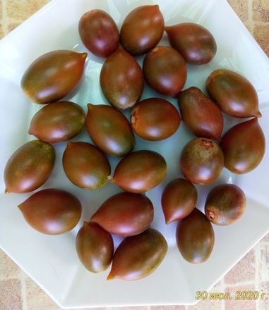Среднеспелый, индетерминантный, в ОГ был до 1,5 метра. Плоды черри, овальные, с носиком, коричнево-красные, массой около 20 грамм. Подхдят для цельноплодного консервирования и вяления, а также употребления в свежем виде. В упак. 10 шт.