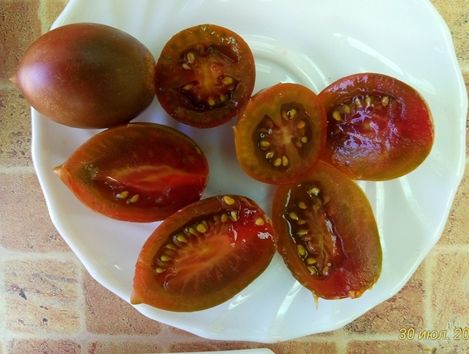 Черри. Сладкий фруктовый вкус. Среднеспелый сорт для пленочных теплиц и открытого грунта. Период от всходов до начала созревания 100-110 дней. Растение индетерминантное, высотой до 1,5-2 м. Плоды овальные, с носиком, красно-коричневые, плотные, гладкие, массой 18-20 г. Очень сладкие, ароматные, с нежным фруктовым вкусом. Для свежего потребления и цельноплодного консервирования.
