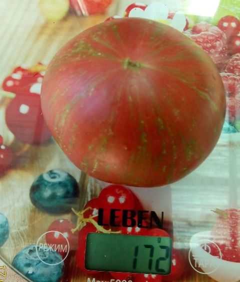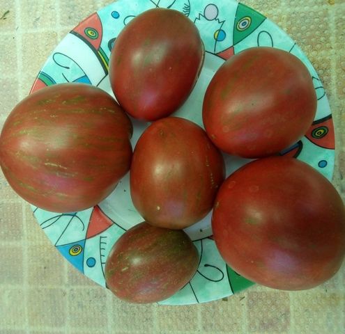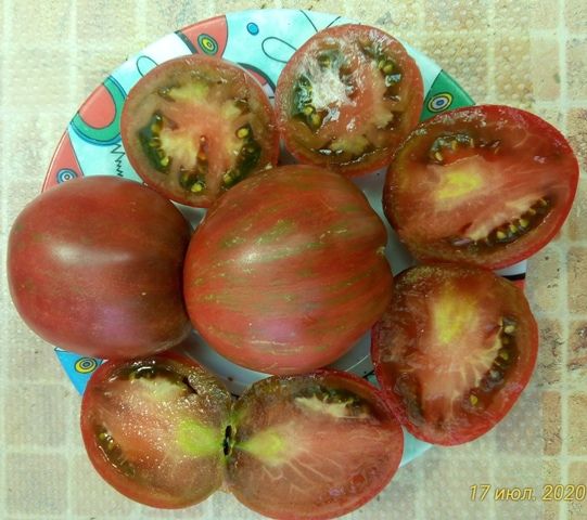 Среднерослый, среднеспелый сорт. Плоды сливовидно-сердцевидной формы , бордово - коричневые с желто-зелеными полосами. Вес 100-200 грамм. Салатный и для заготовок. Куст слабооблиственный.