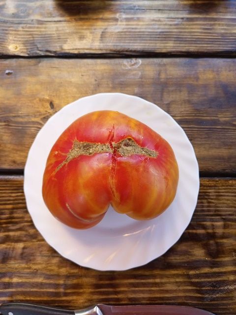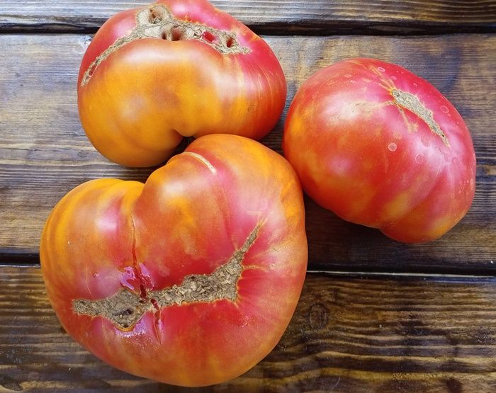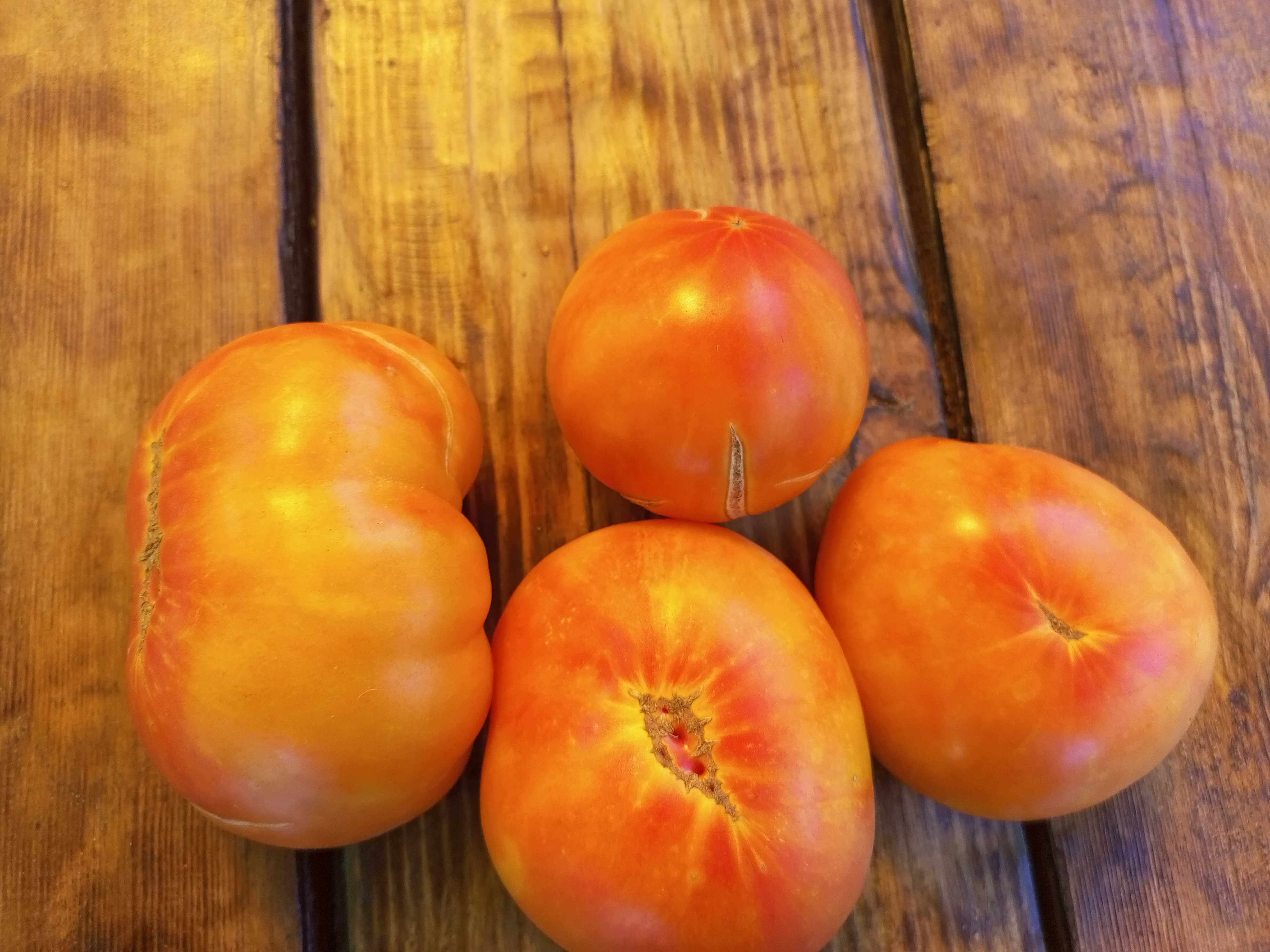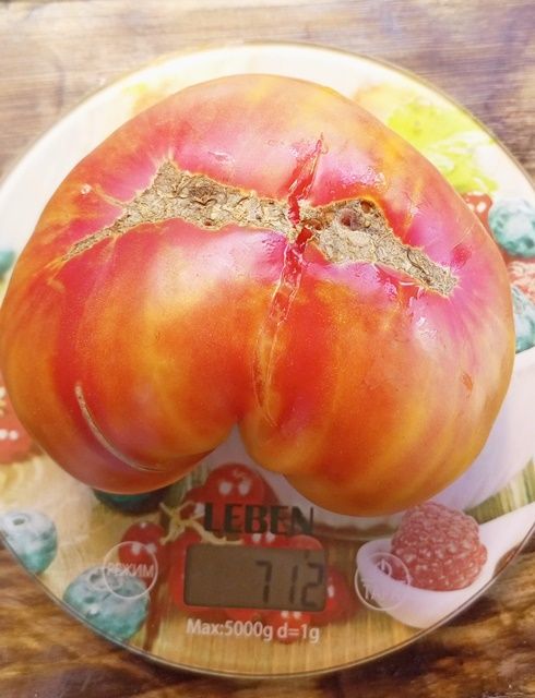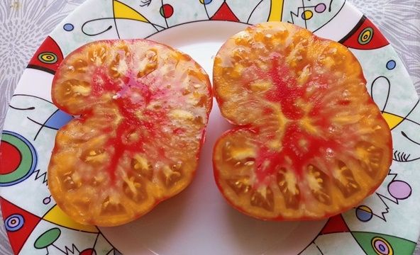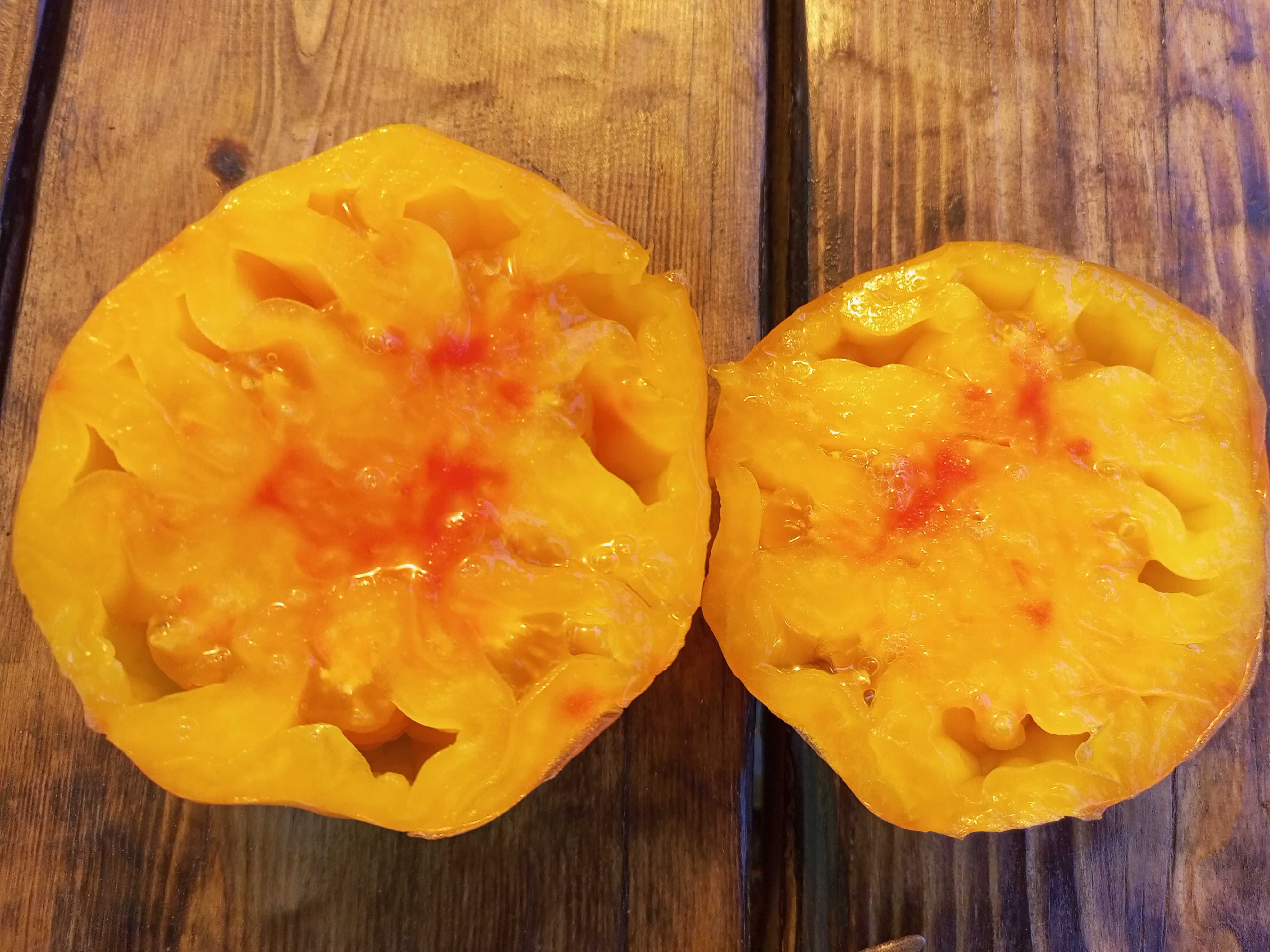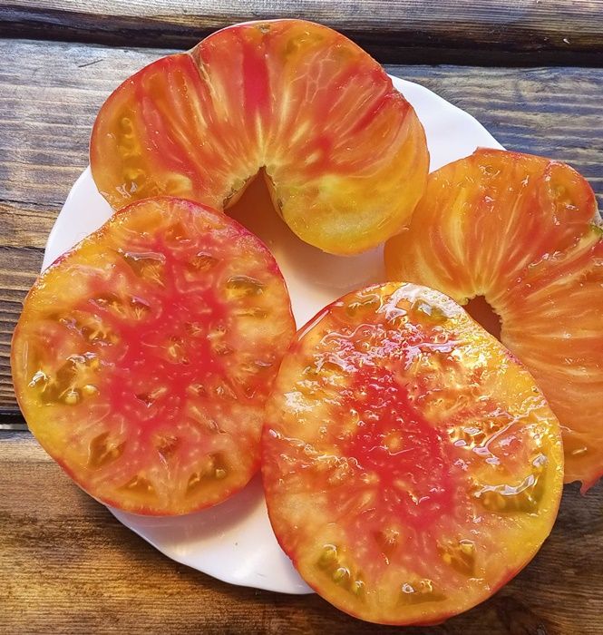 Среднепоздний, высокорослый, крупноплодный урожайный сорт. Плоды плоскоокруглые, бифштексного типа, желто-оранжевые с красной шапочкой, биколоры, вес 200-800 грамм. Мякоть двухцветная, желтая с красной серединкой. При полном поспевании становятся почти красными. Вкус сладкий, фруктовый, без кислоты. Салатный сорт. В упак. 10 шт.