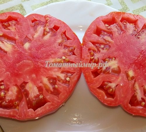 Среднеранний, высокорослый сорт. Плоды ярко-красные, плоскоокруглые, крупные, 400-800 грамм (у меня в 2013 году был томат на 1395гр, без формировки, и особого ухода), мясистые, вкус гармоничный, со сладостью и кислинкой. В упак. 10 шт.