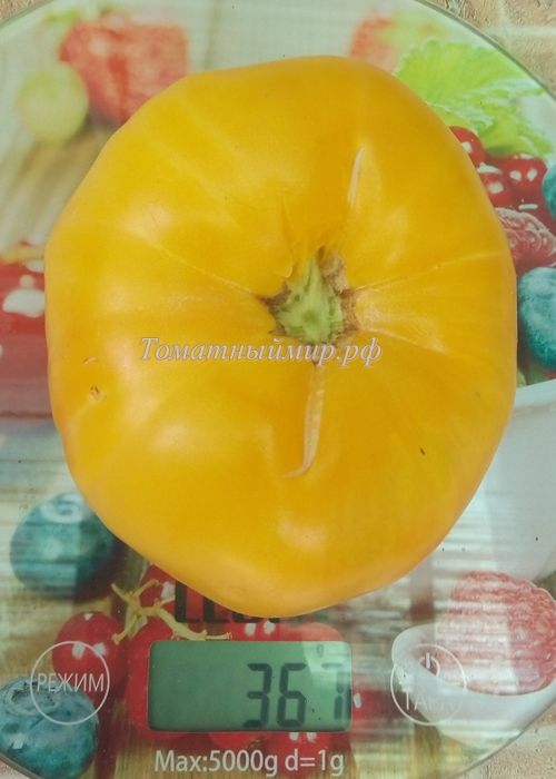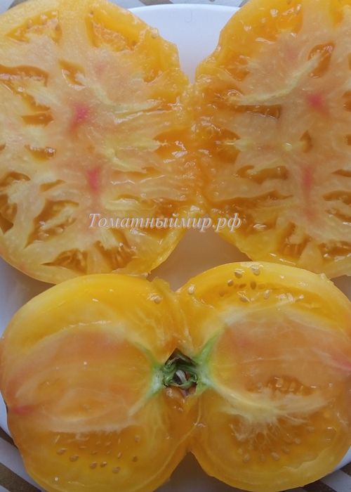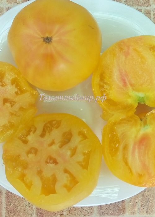 Среднеспелый, высокорослый сорт. Плоды плоскоокруглые, светло-желтые с небольшим румянцем в полной спелости, вес 300-400 грамм. Вкус со сладостью. Мякоть нежная, с фруктовым привкусом. Салатный сорт и для переработки на соки, соусы. В упак. 10 шт.