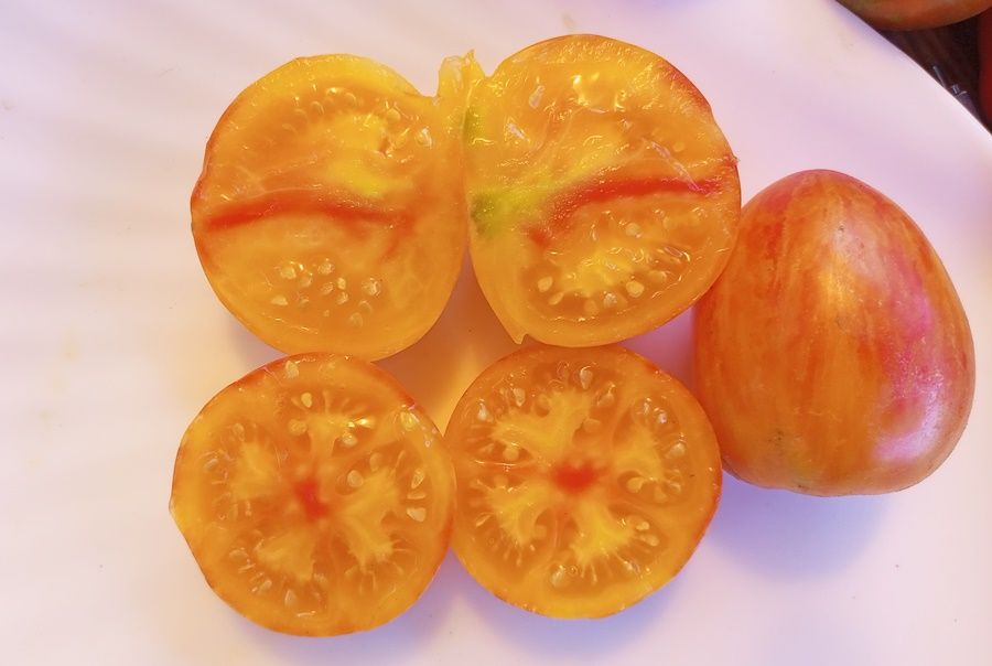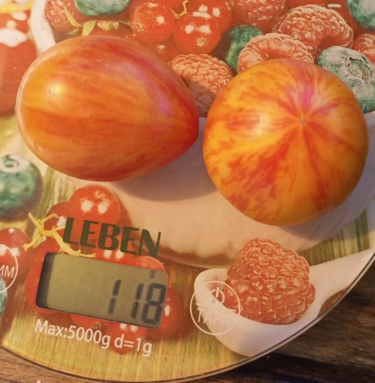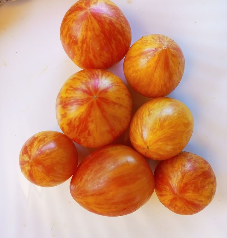 Среднерослый, куст в теплице около полутора метров, урожайный, среднеспелый сорт томата. Плоды некрупные округлые сердечки, вес 60-150 грамм, двухцветные, желтые с красными полосками и штрихами. очень красивые! Вкус сладкий, с фруктовым ароматом. В упак. 10 шт.