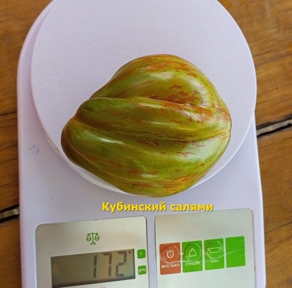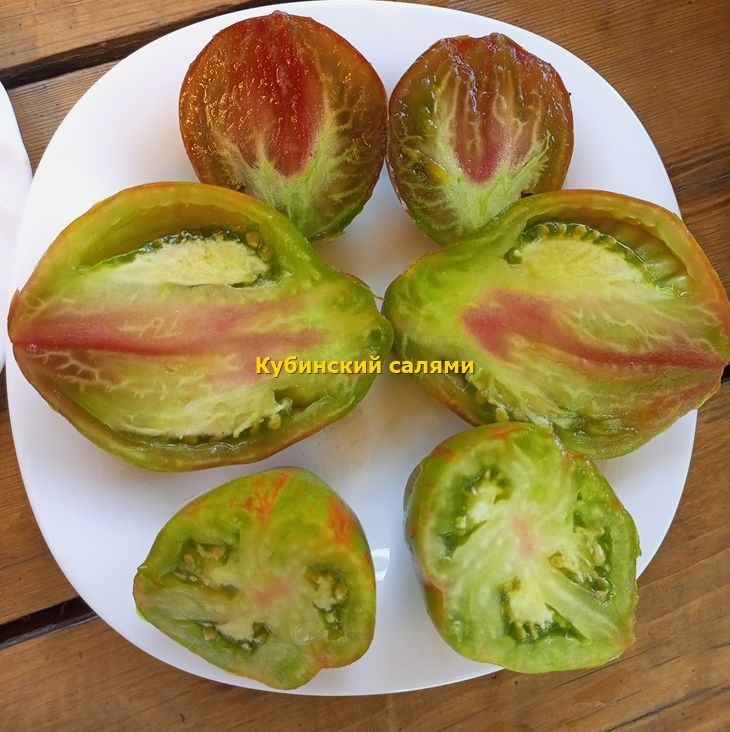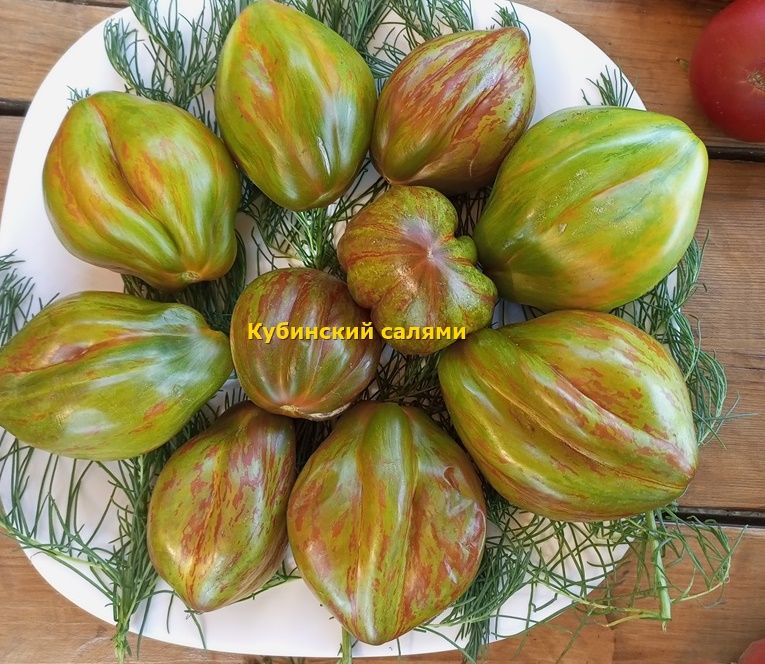 Индетерминантный, высокорослый, в теплице куст был около 2-х метров, среднеспелый сорт. Плоды необычной формы и интересной расцветки, Плоды удлиненно-перцевидные, ребристые. Цвет томатов зеленый с бордовыми полосками. На разрезе зеленые с бордовым.100-180 грамм. Вкус томатный, хороший. Сорт подходит для свежего потребления. В упак. 8 шт.