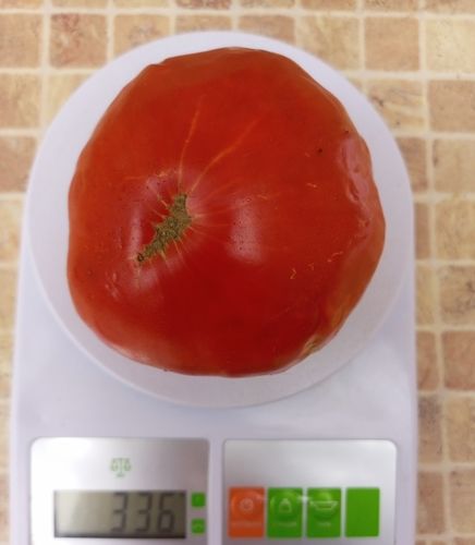 Детерминантный (в ОГ около 1 м), среднеранний урожайный сорт. Плоды плоскоокруглые, красные, крупные, вес 300-400 грамм, отдельные крупнее, мясистые, сладкие. Салатный сорт и для переработки на сок, пасту. В упак. 10 шт.