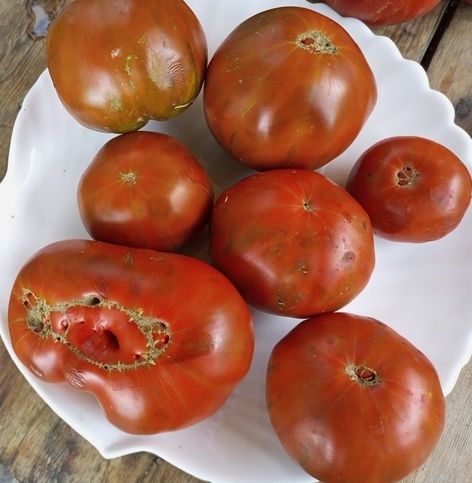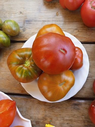 Высокорослый, среднеспелый сорт. Плоды крупные, красивого кирпичного цвета с более темными плечиками, вес 300-500 грамм. Мякоть бордово-коричневая, сладкая с кислинкой, вкус яркий, насыщенный. Вкусный салатный сорт. В упак. 10 шт.