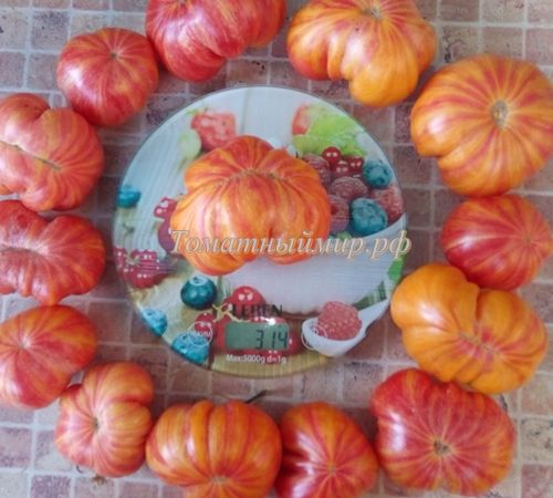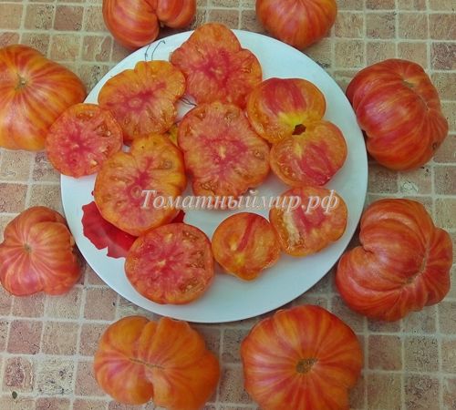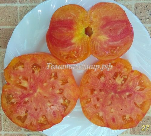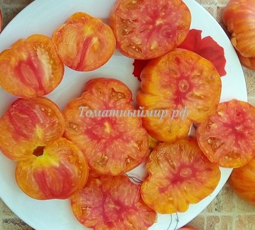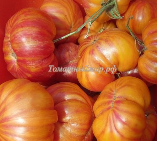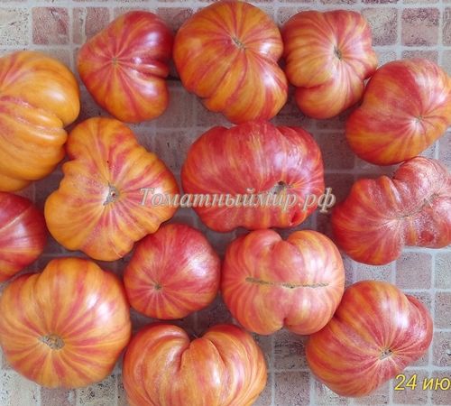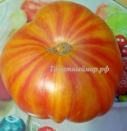 Индетеминантный, среднепоздний сорт. Плоды плоскоокруглые, с небольшой ребристостью, оранжево-желтые с красными полосками, на разрезе желтые с красным. Мякоть плотная, с малым количеством сока, сладкая, очень вкусная. Вес 200-400 грамм. В упак. 8 шт.