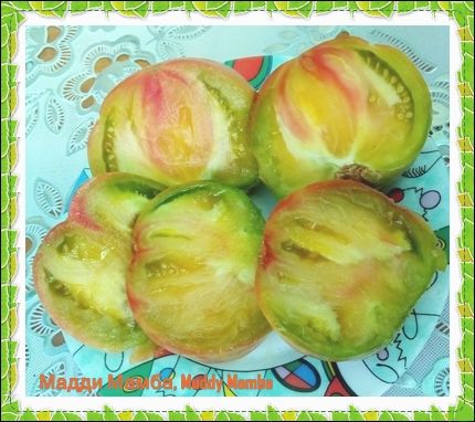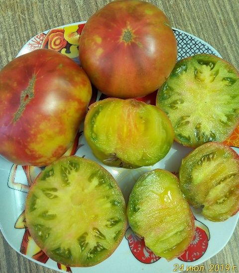 Высокорослый, среднеспелый. Плоды плоскоокруглые, окраска бордово-зеленого цвета, вес 250-350 грамм, отдельные плоды до 450 грамм. Мякоть зелено-бежевая с розовыми вкраплениями, очень сладкая, фруктового вкуса. Плодоношение длительное, высокая урожайность. В упаковке 8 штук.