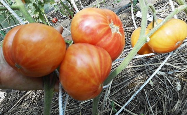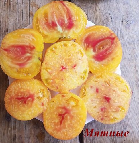 Индетерминантный , среднепоздний сорт. Плоды плоскоокруглые, крупные, с плотной мякотью, желт-оранжевые, с красными полосками. При полном созревании красного цвета становится больше. Очень вкусный, сладкий, с фруктовым вкусом. Салатный сорт. В упак.10 шт.