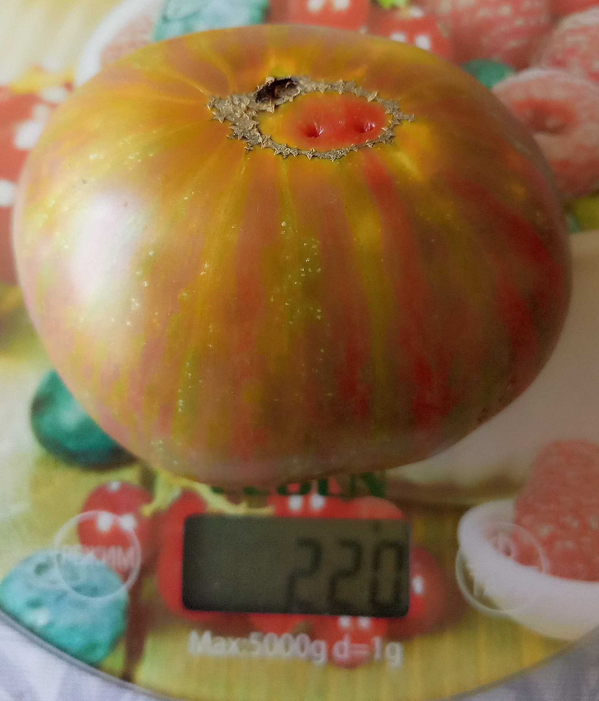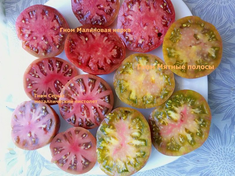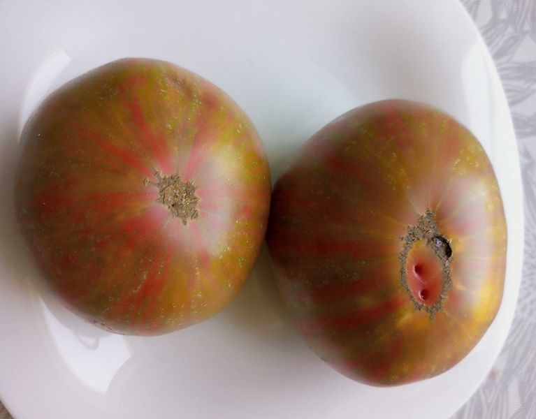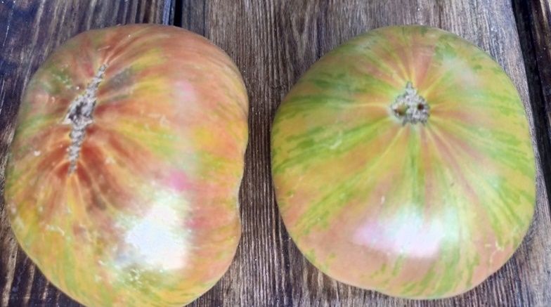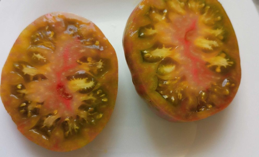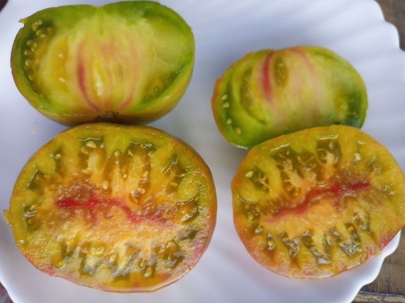 Детерминантный, высота куста около 1 метра, среднеспелый сорт. Плоды биколоры, зеленые с красными полосами, в полной спелости зеленый цвет становится оливковым, на разрезе желтовато-зеленые с красным пятном, округлые и плоскоокруглые, выровненные, вес 150-250 грамм. Мякоть сочная, сладкая. Салатный сорт. В упак. 10 шт.