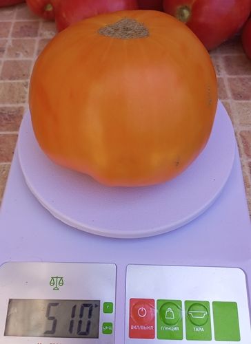 Среднеспелый, индетерминантный (в теплице 1,7 м.) сорт. Плоды крупные , бифштексного типа, оранжевые, с небольшим румянцем в полной спелости, мясистые, сладкие, ароматные. Вес 300-500 грамм. Салатный сорт.