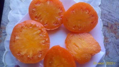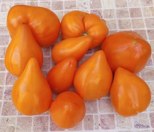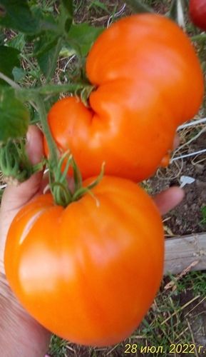Индетерминантный, среднеспелый урожайный сорт с длительным периодом плодоношения. Плоды сердцевидные, желто-оранжевые, Мякоть сладкая, плотная, почти без сока, сахаристая на изломе, прекрасного вкуса. Вес 150-400 гр. В упак. 10 шт.
