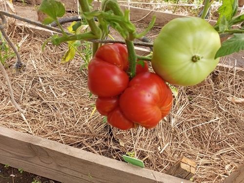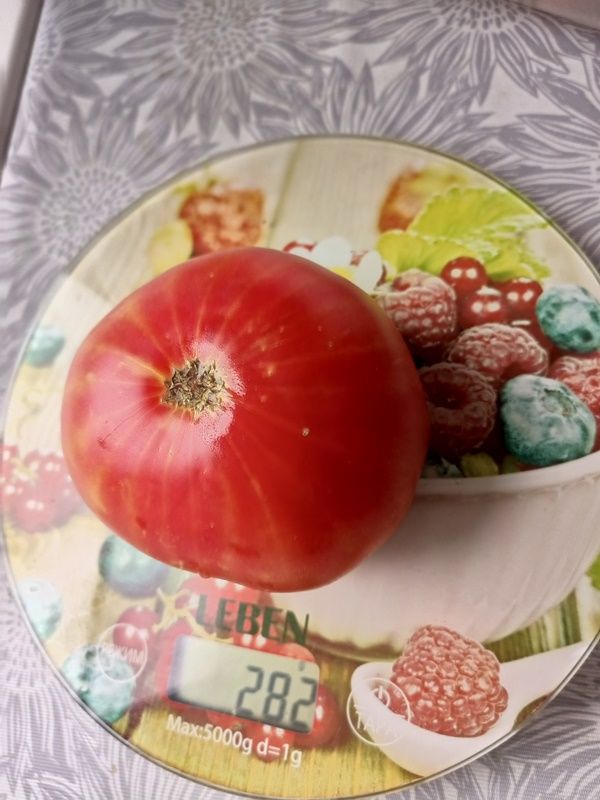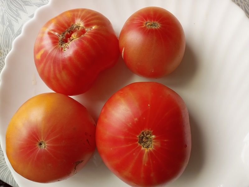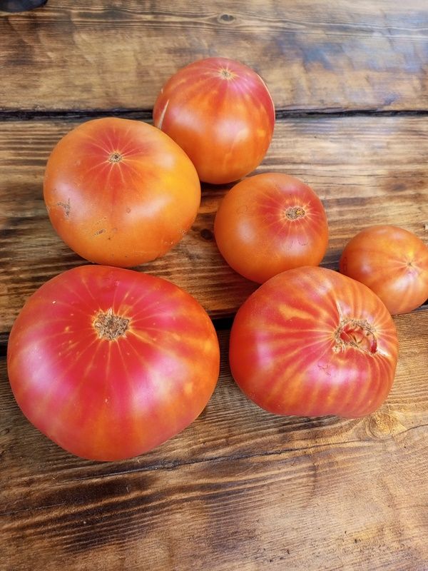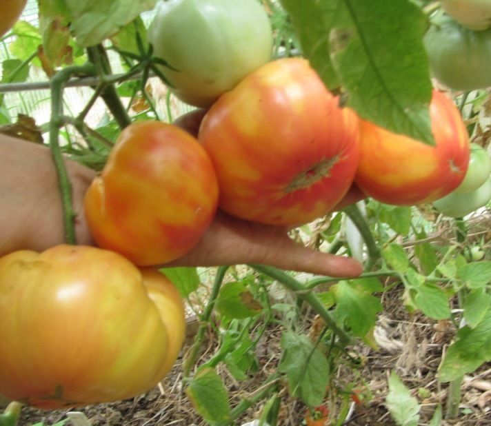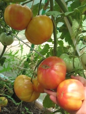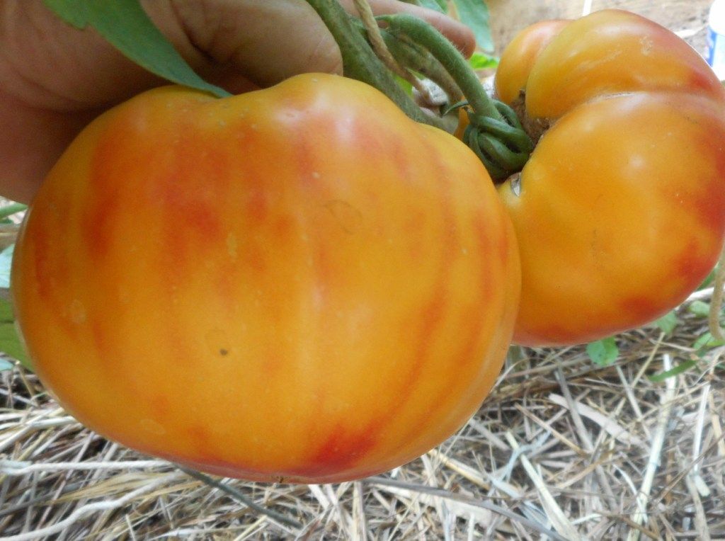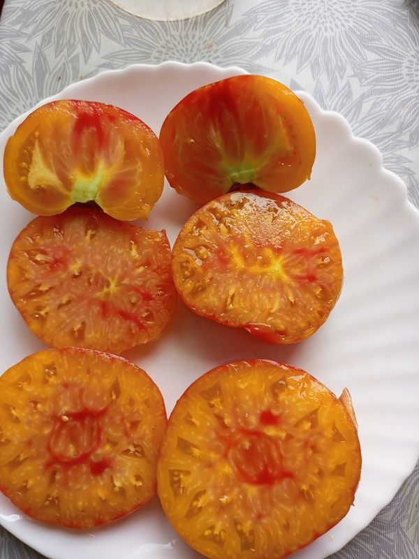 Среднепоздний сорт, индетерминантный, куст высотой 170 см. Плоды плоскоокруглые, крупные, массой 400-500 грамм, оранжевые с розовыми разводами, очень нарядные. Мякоть мясистая, почти без сока, очень сладкая. Салатный сорт. В пакете 10 семян.